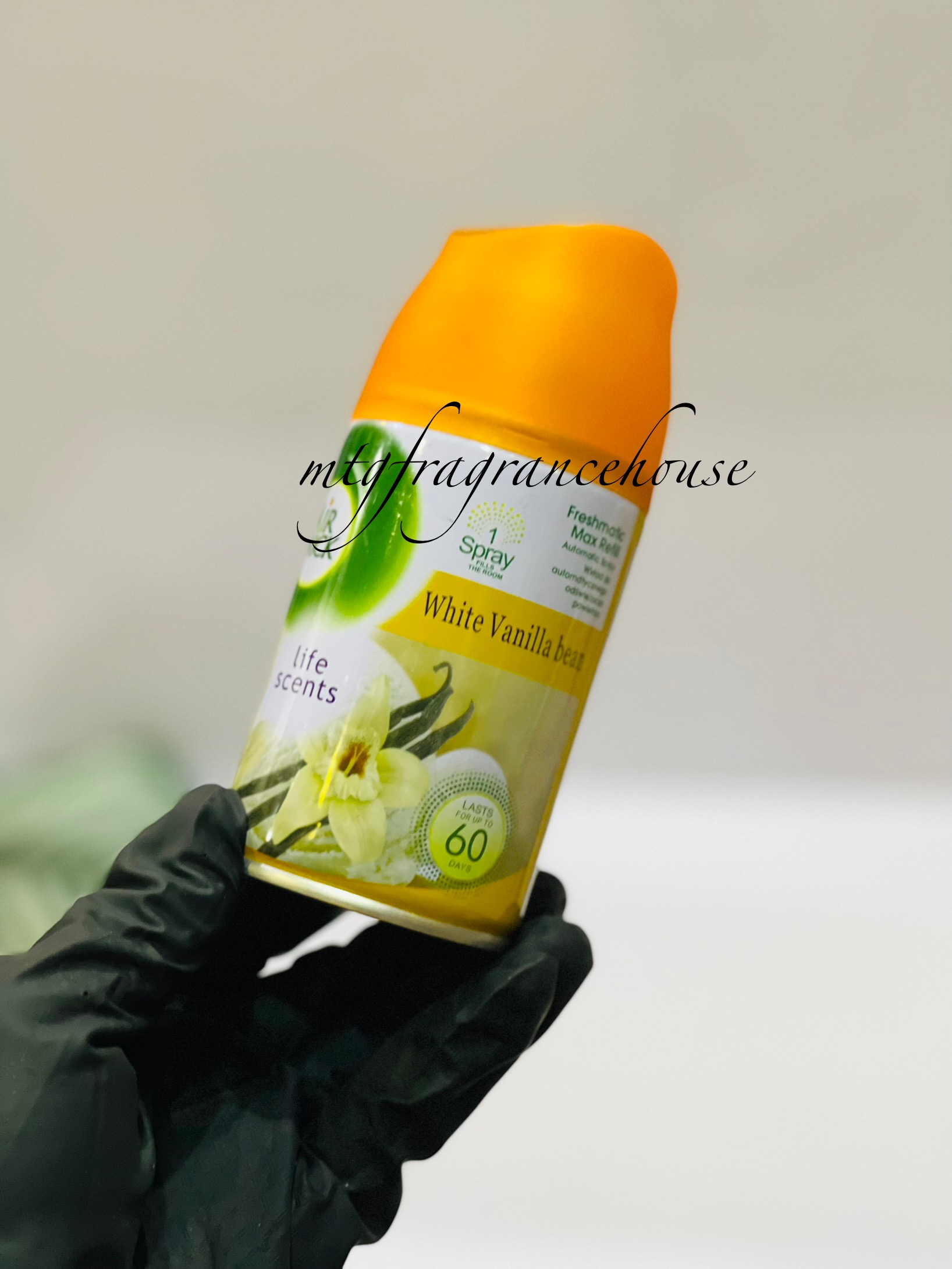 It’s an automatic spray refill (aerosol) from Air Wick, under the “White Vanilla Bean” fragrance line.