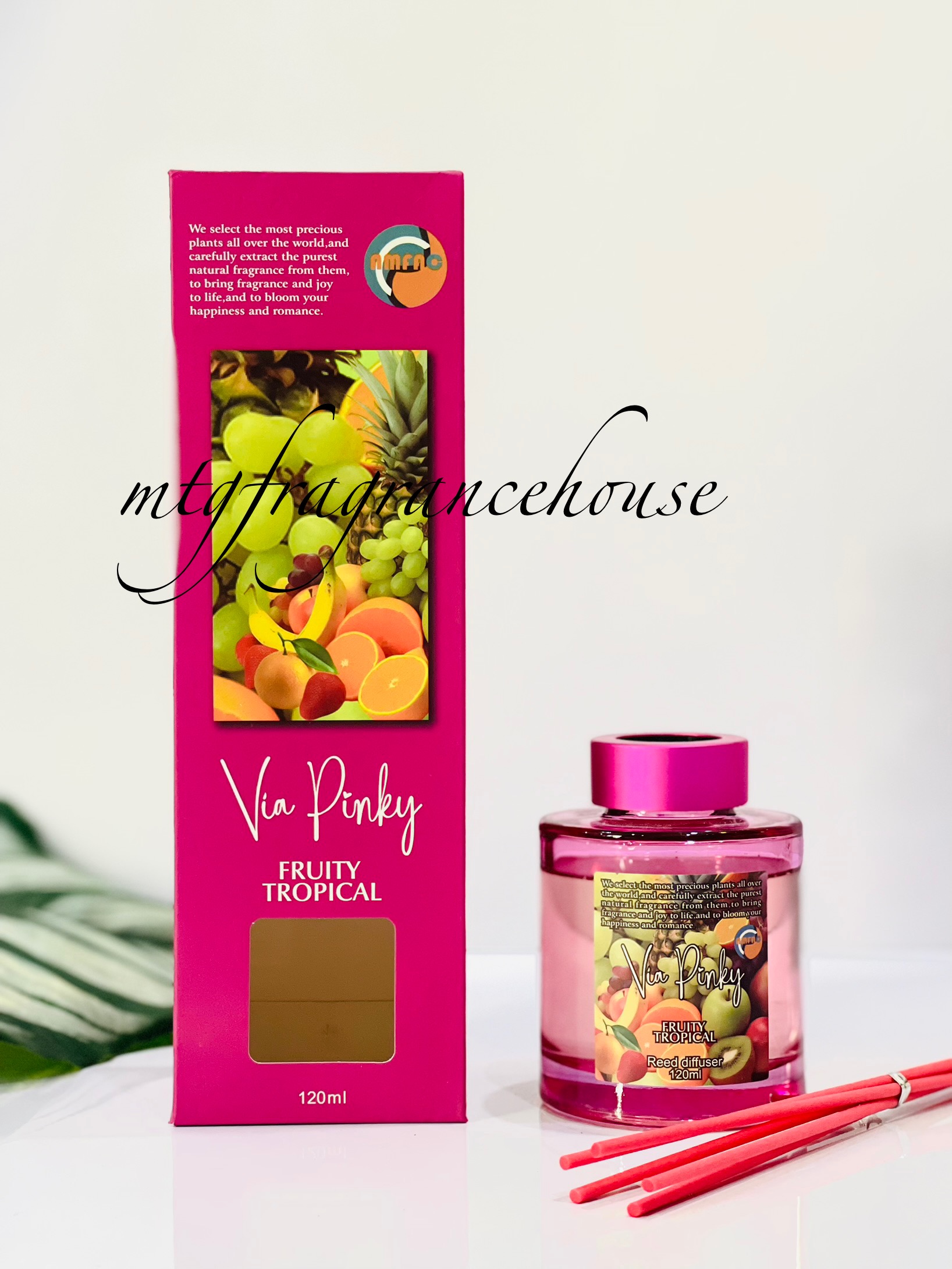 Amfac Via Pinky – fruity tropical Reed diffuser scent aims to evoke warm, lush, juicy, exotic fruit vibes — think of pineapple, mango, coconut, passionfruit, papaya, citrus, etc. Often it’ll have a summery, vacation‑feel; bright, sweet, juicy, sometimes creamy tropical notes + possibly some greenery or florals to balance.
