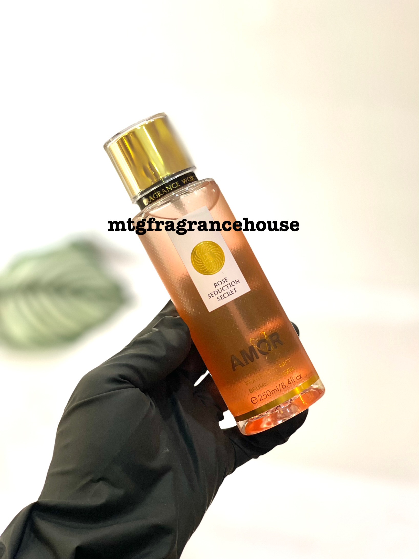 Rose seduction secret Amor body mist (250ml) by Fragrance World is a delicate floral-fruity mist with a soft, romantic vibe—it opens with crisp juniper, blooms into sweet apricot and apricot blossom, and settles on a clean, gentle cotton flower base.