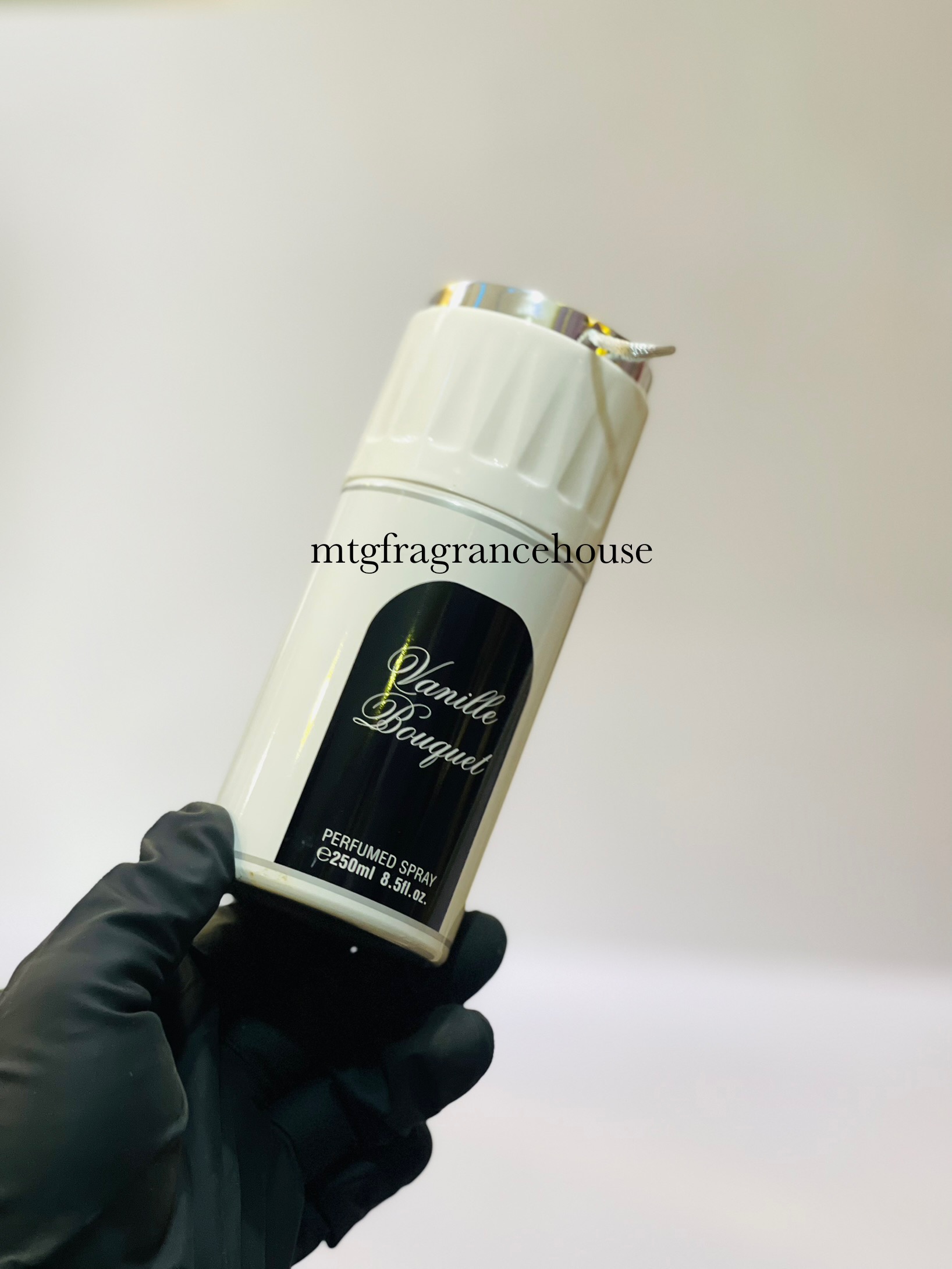 Vannile bouquet body spray (250ml) by Fragrance World is a cozy, citrus-vanilla spray that opens with fresh orange and lemon, warms into creamy Madagascar vanilla and amber, and finishes clean with white musk and a hint of bergamot—simple, elegant, and softly comforting.