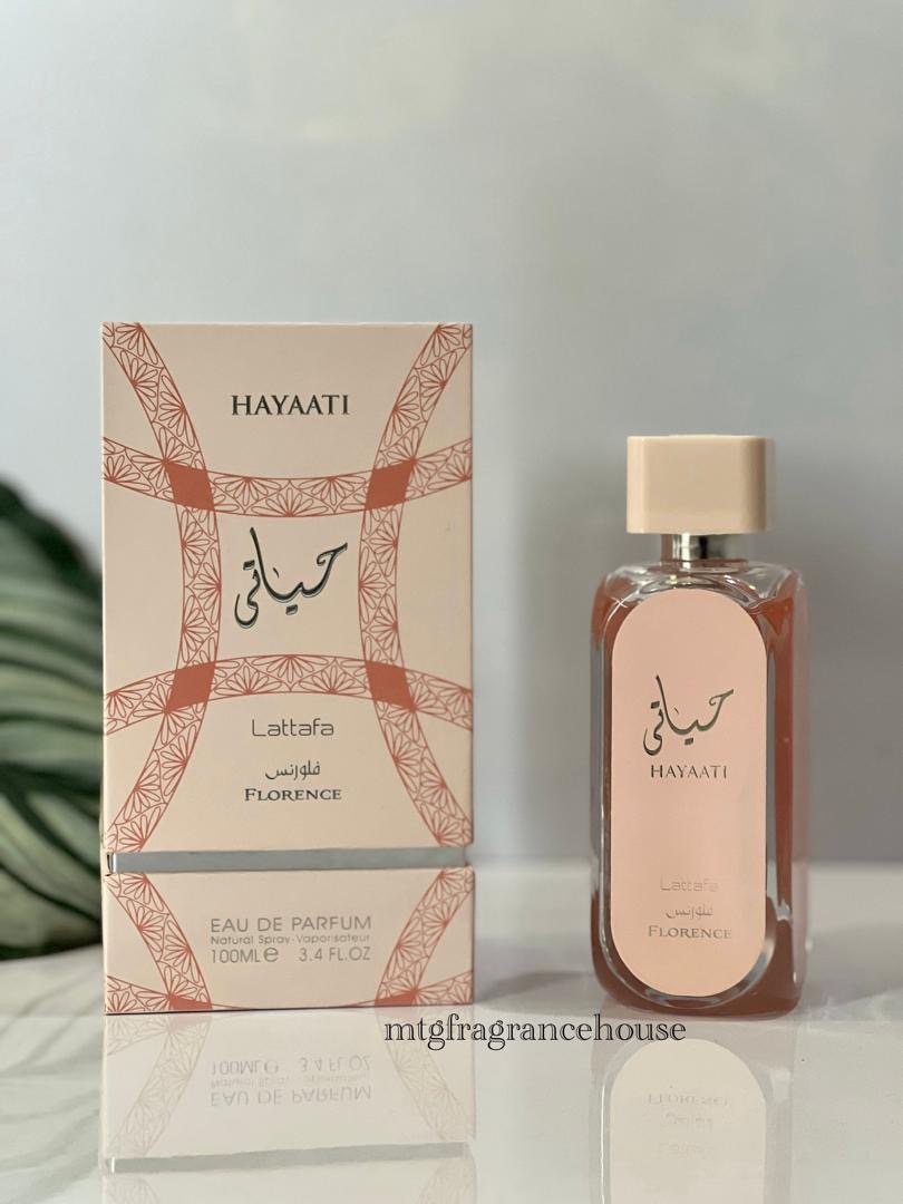 HAYAATI FLORENCE (100ml) EDP LATTAFA opens with juicy lychee, grapefruit, and red currant, unfolds into a romantic heart of rose, peach, and cedarwood, and settles into a creamy, gourmand base of vanilla, praline, and amber—a charming floral-fruity-gourmand fragrance perfect for women who love soft, radiant scents with a playful yet elegant character.