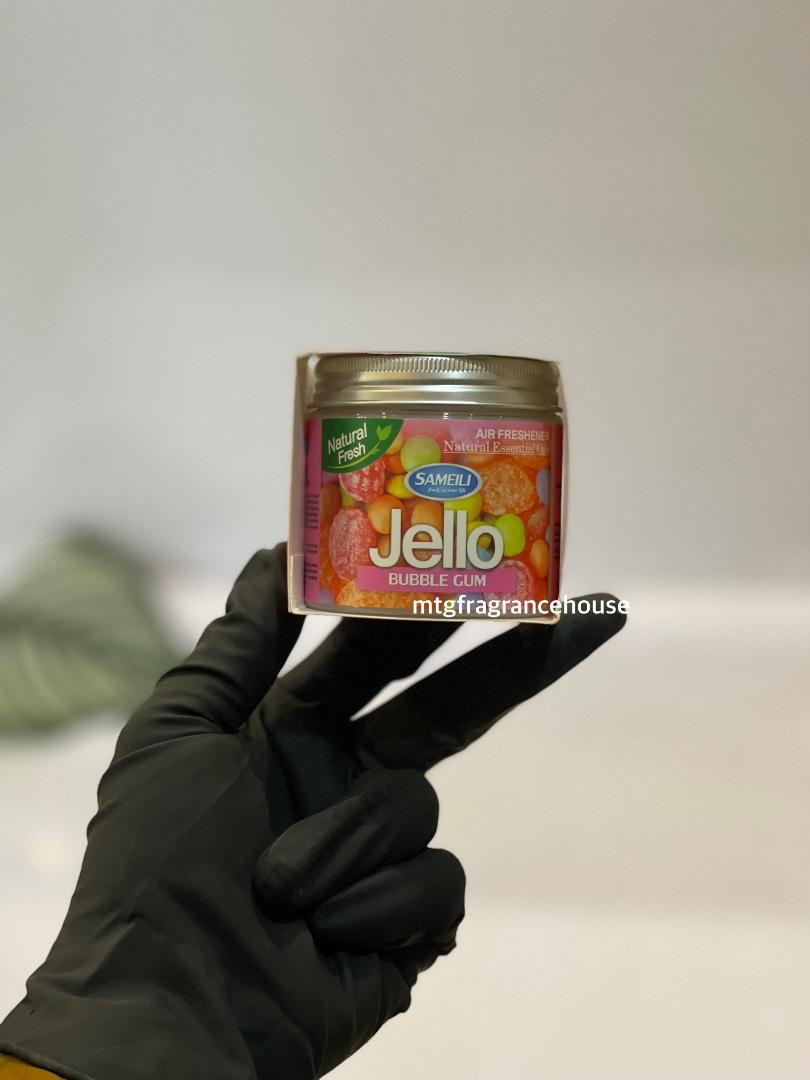 A gel‑based air freshener by Jello scented with Bubblegum.