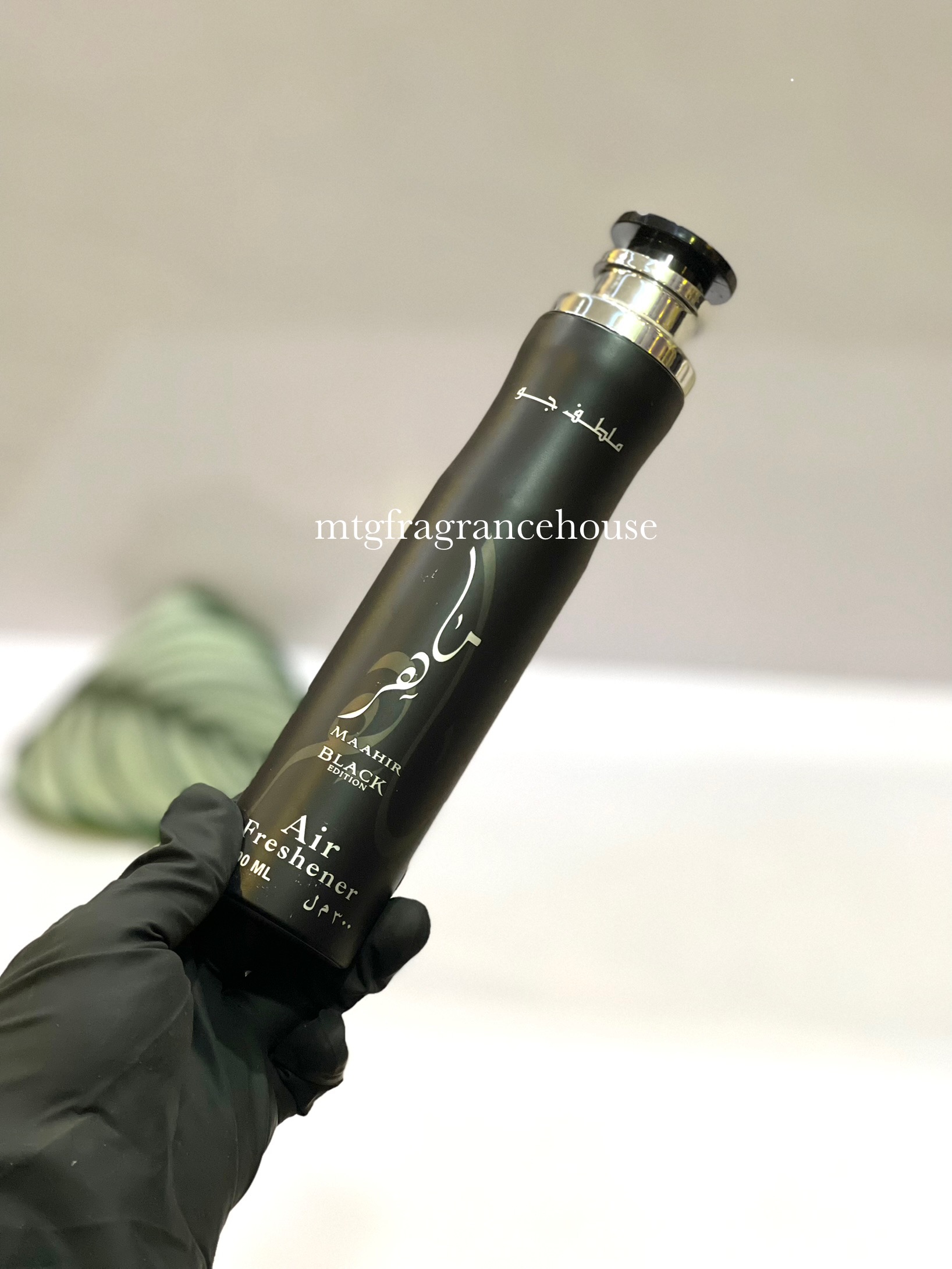 Lattafa Maahir Black Room Spray is a bold, sophisticated oriental-spicy fragrance packed with black and pink pepper over a heart of resinous labdanum and rhubarb, grounded in rich leather, cedar, patchouli, musk, and moss—ideal for creating a deep, luxurious ambiance.