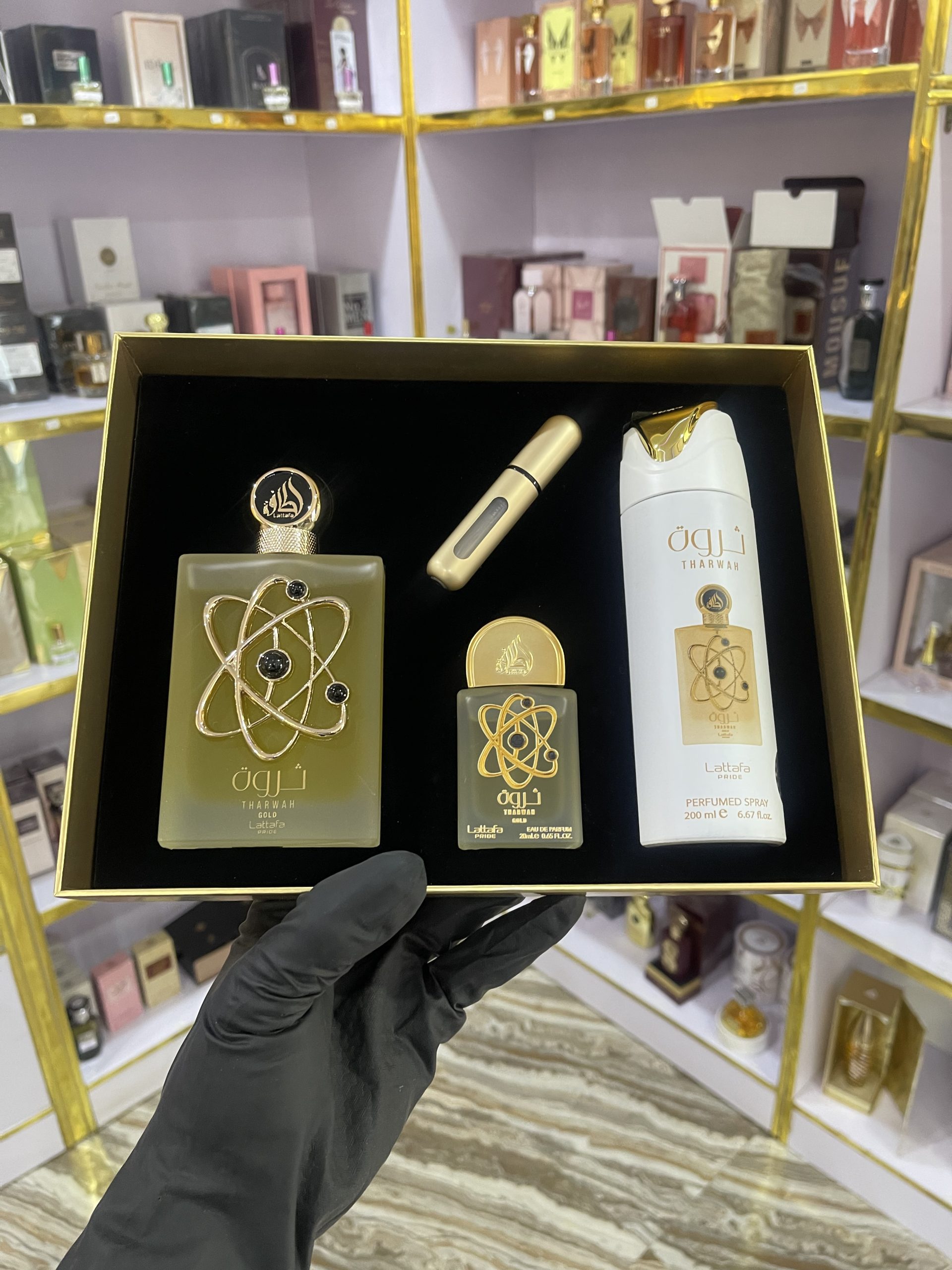 Tharwah Gold Set EDP by Lattafa is a captivating unisex fragrance that masterfully balances fresh florals with warm, comforting sweetness. It opens with the aromatic freshness of lavender and the zesty brightness of bergamot, creating an invigorating start.