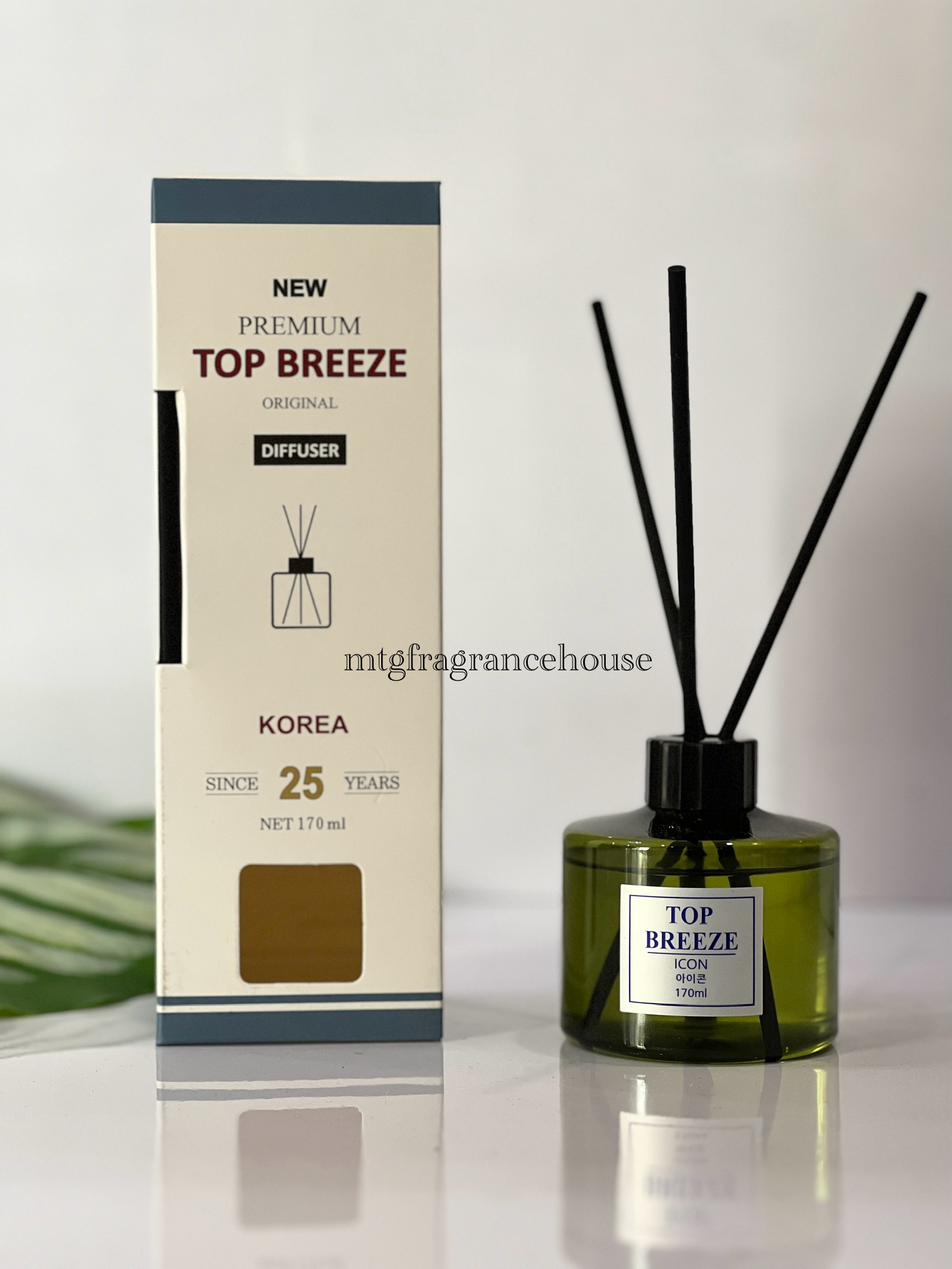 The “Icon” scent is one of several distinct fragrance variants offered in the Top Breeze reed diffuser line, alongside names like Chanel, CK‑1, Cocktail, Sweet Lavender, Black Cherry, Peach, White Lemon, and more.